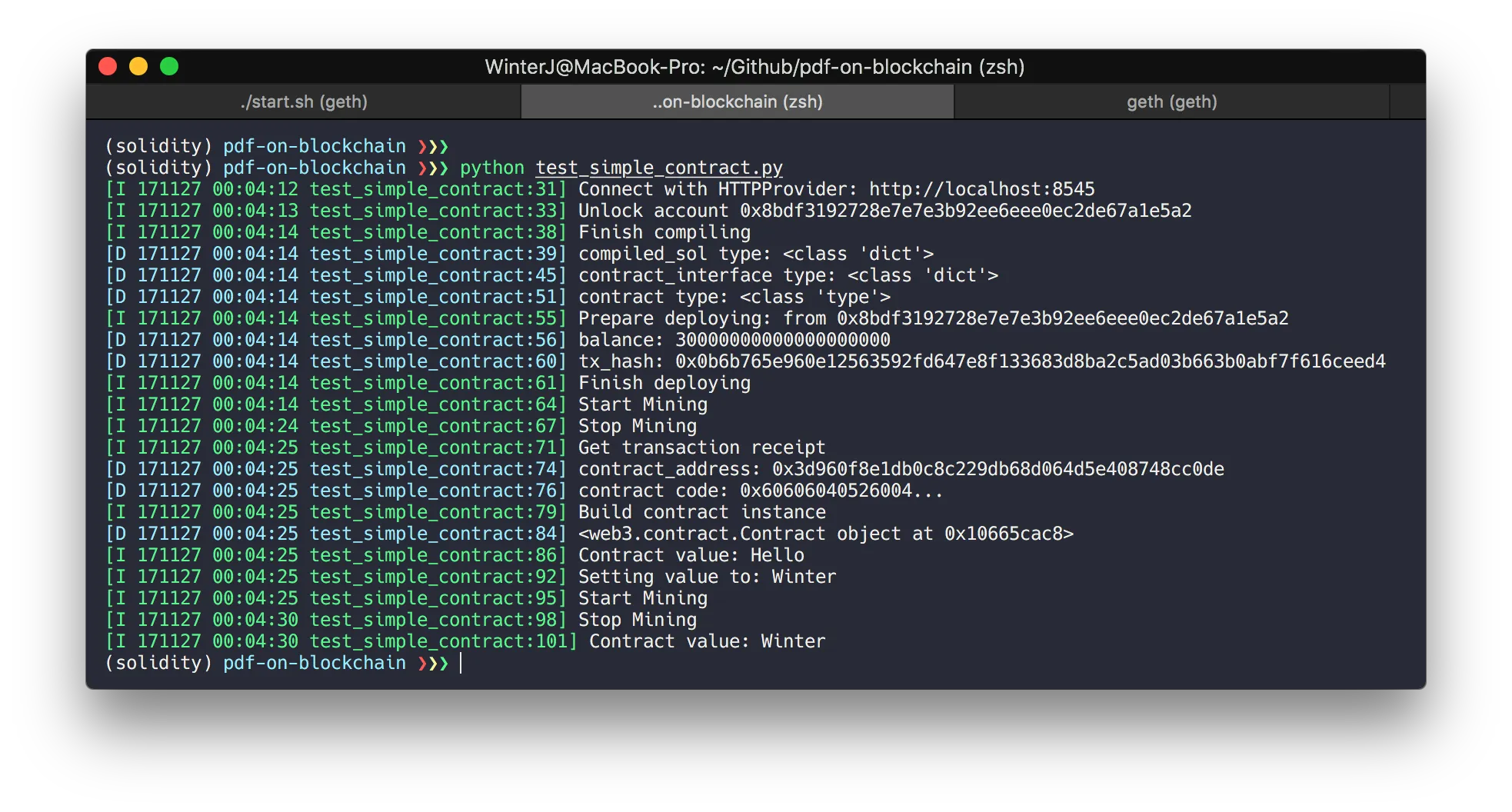 11월 21일 화요일, 블록체인 스터디에서 web3.py를 이용한 스마트 컨트랙트 배포와 활용에 대해 발표했다. 본래는 PDF파일을 블록체인에 올린 원본 증명 서비스의 간단한 개념 증명을 구현하려 했지만, 초기 계획보다 작업을 많이 하지 못해 2주에 걸쳐 작업하기로 결정했다. 이 글을 통해 이더리움 노드를 설치해 구동시키고 파이썬을 사용해 스마트 컨트랙트를 컴파일 한 후 배포하기까지의 과정 과 그러면서 있었던 여러 문제 상황들을 어떻게 해결했는지 회고하고자 한다.
