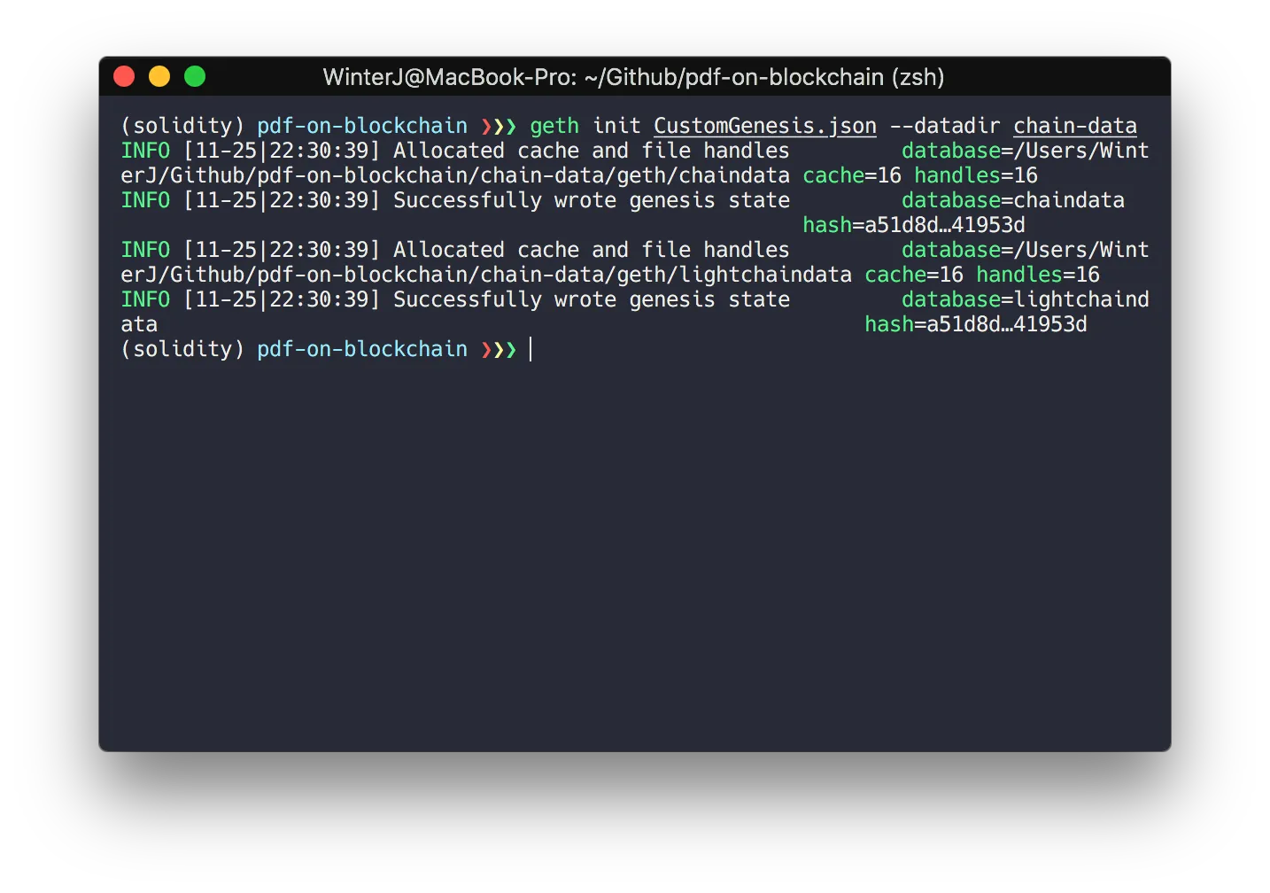 그 후 geth init CustomGenesis.json --datadir chain-data 를 통해 초기 프라이빗 네트워크 환경을 구성해준다. 이 때 --datadir 인자로 체인 데이터가 쌓일 폴더를 지정해줄 수 있다.
